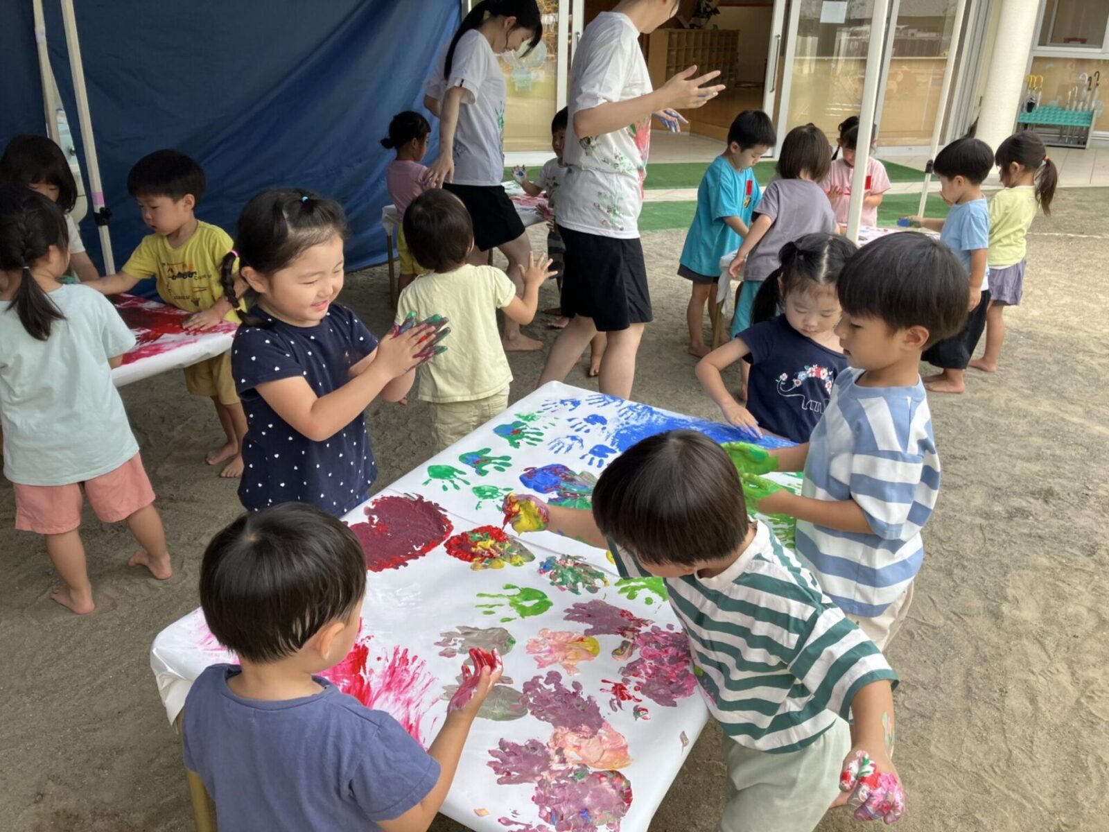 天気の良い日は園庭で泥んこ遊びや水遊び、雨天の場合は室内遊びをして過ごします。