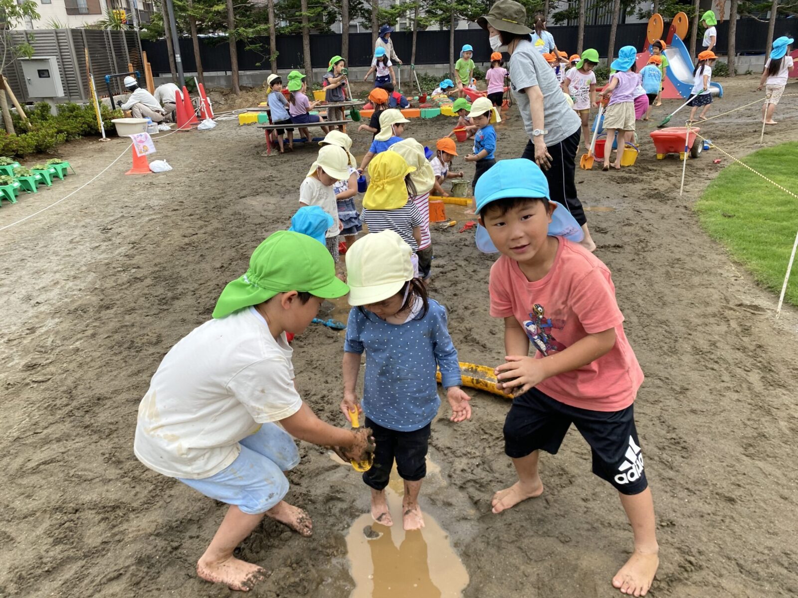 ※お天気の良い暖かい日の自由遊びは、泥んこ遊びを行い、身近な遊びの中から、健康な身体作り、泥の感触、自然の変化などの